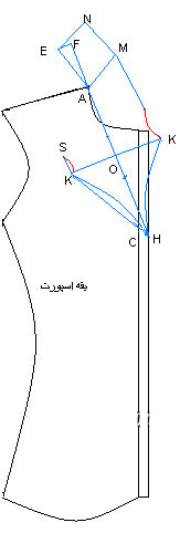 از نقطه K به H وصل می کنیم H.K نصف می شود نیم ساز ۲ سانتی بیرون می آییم از نقطه Kبه H هلال کرده اگر پهنای یقه کمتر از ۱٫۵ سانت بود دنباله هلال از نقطه K کمی دلخواه بالا می آییم A.H از خط شکست الگو را تا می کنیم نقطه S.K.H رولت می کنیم روی آن طرف در بیاید به اندازه ای (۱/۶+۱) دور گردن از نقطه Aبالا می رویم F با خالت قائمه روی خط A.F می گذاریم از نقطه Fبه حالت قائمه ۳ سانت خارج